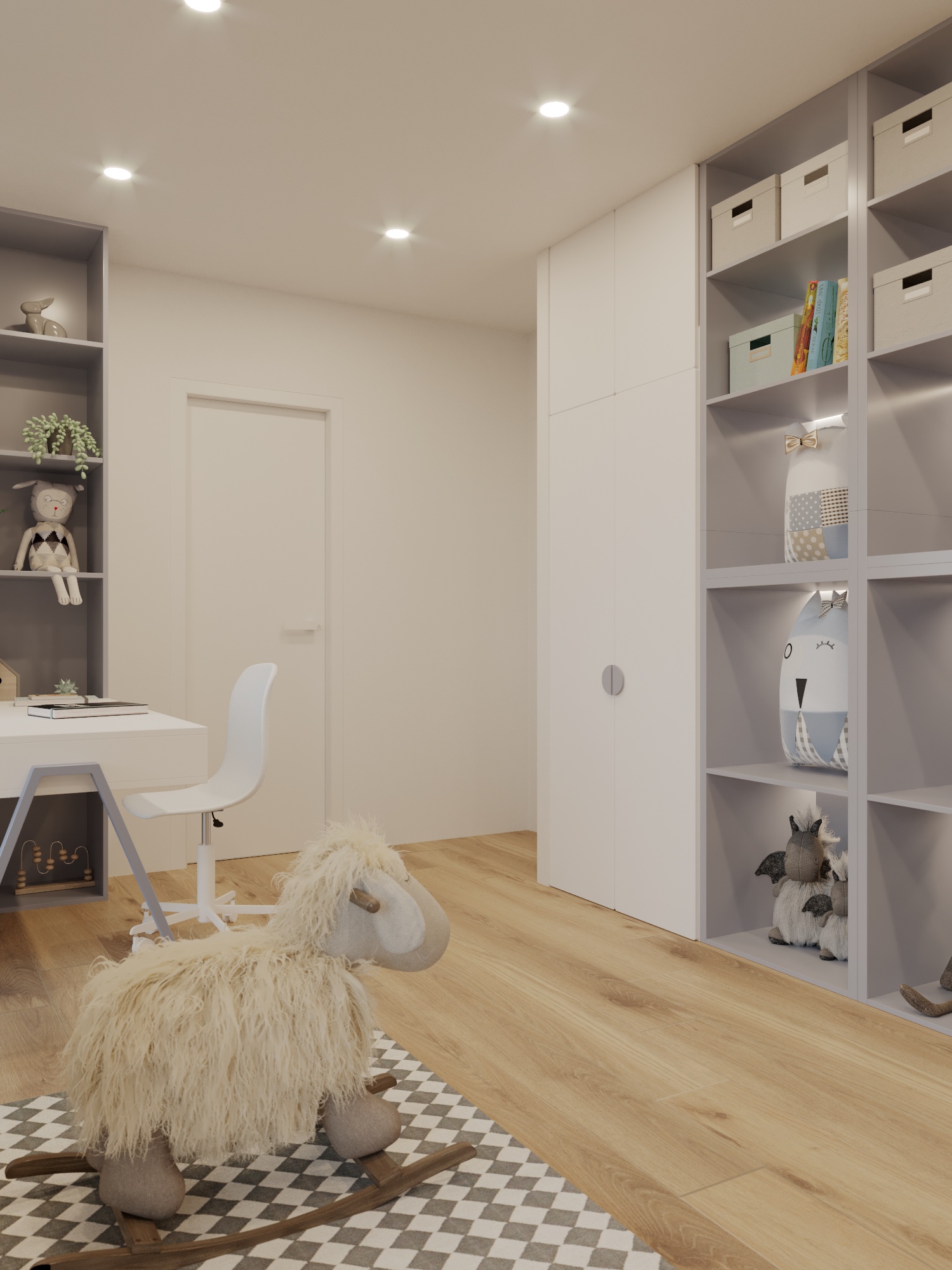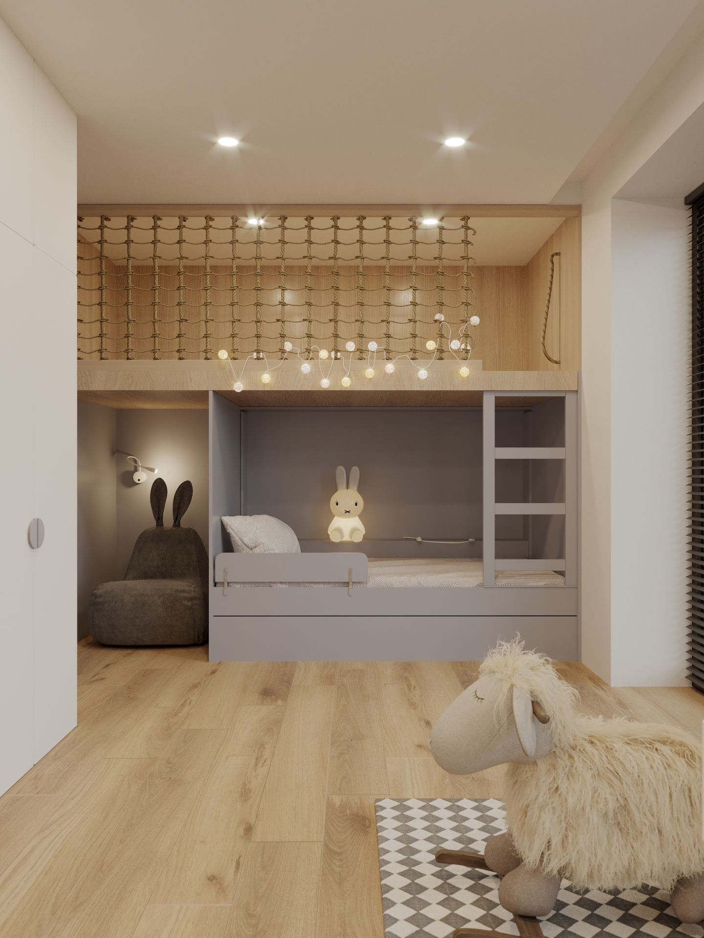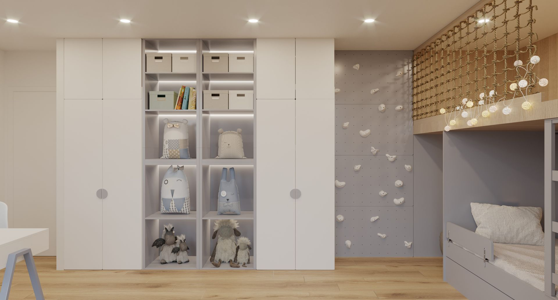 The room is decorated in soft purple tones, combining playfulness with calmness. This color palette stimulates the imagination while maintaining a balanced mood. Thoughtful zoning provides space for play, sleep, and peaceful exploration of the world.