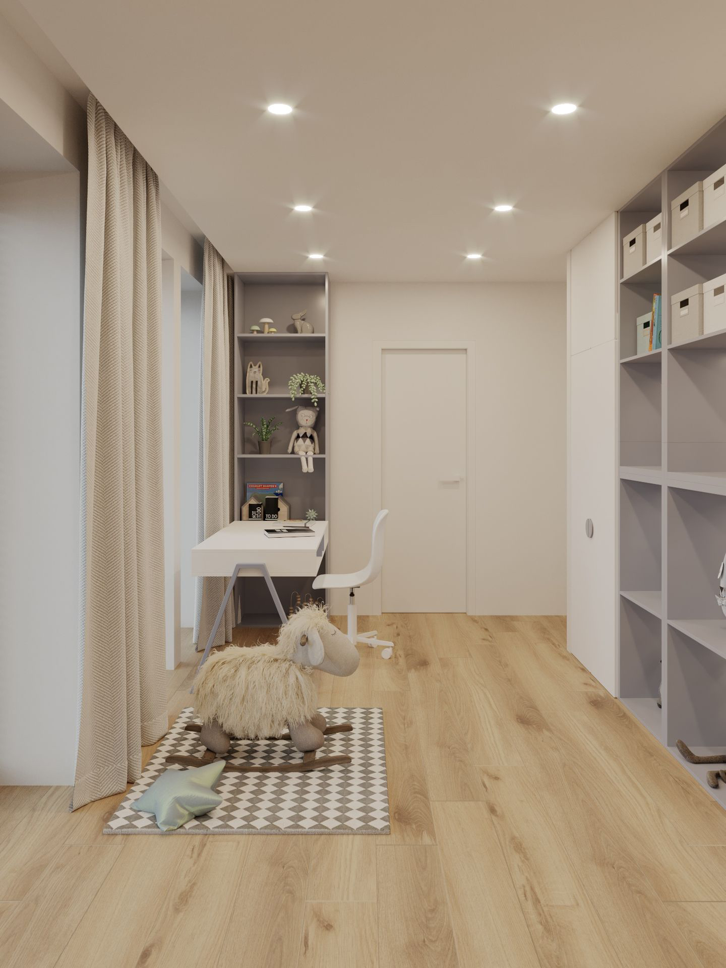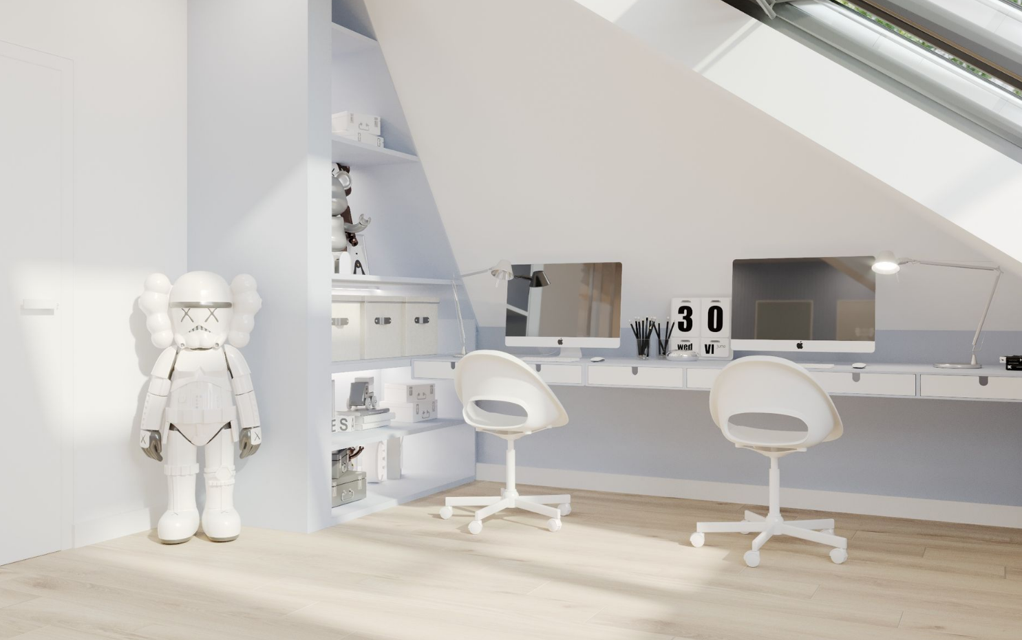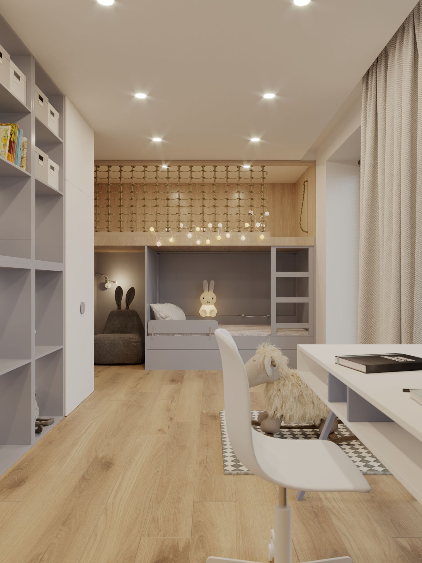 The room is decorated in soft blue tones, which promote concentration, calmness, and a sense of security. The color scheme creates a cozy atmosphere that is suitable for both study and relaxation. Functional furniture and soft lighting give the space a more mature character while retaining a childlike lightness.
