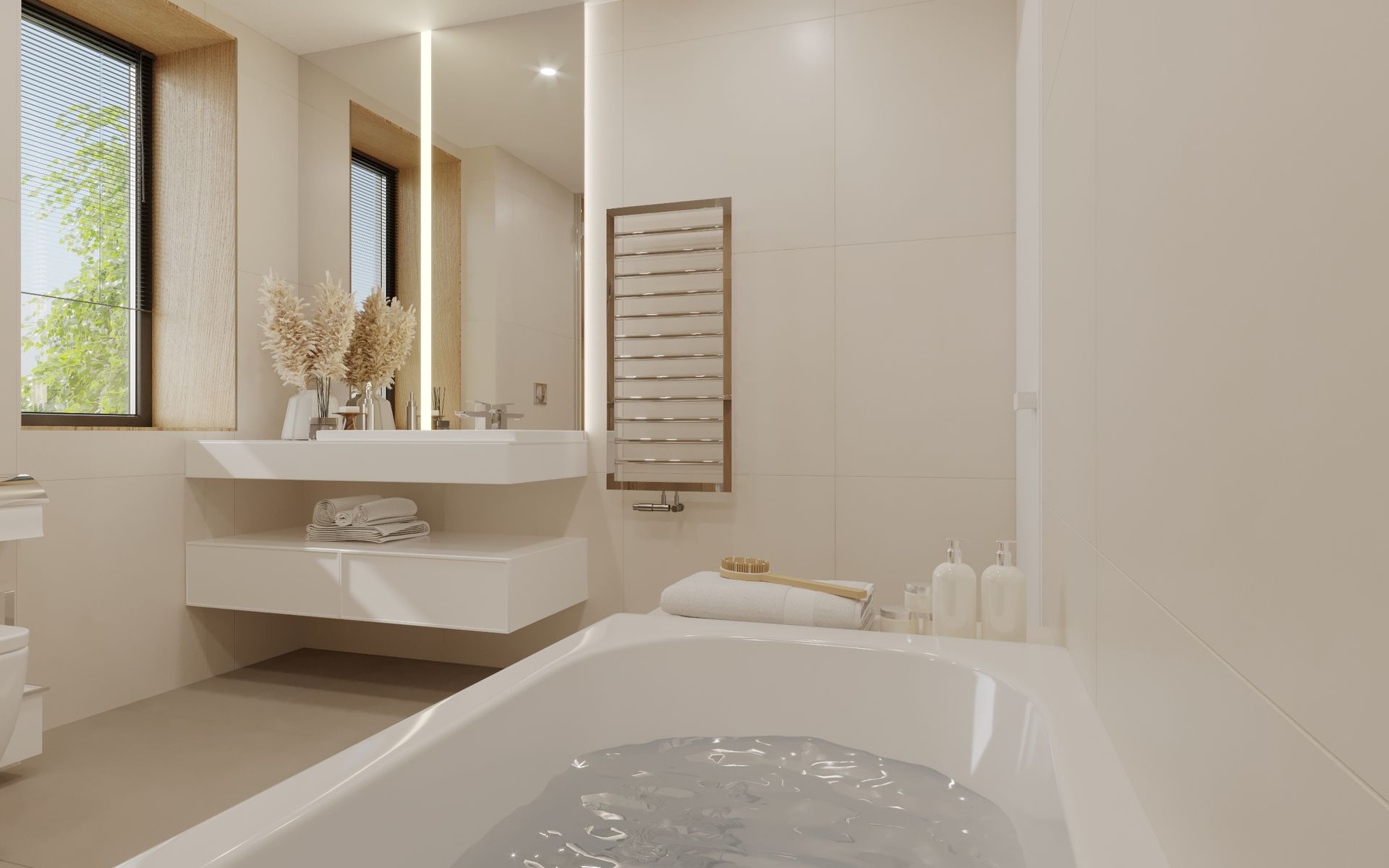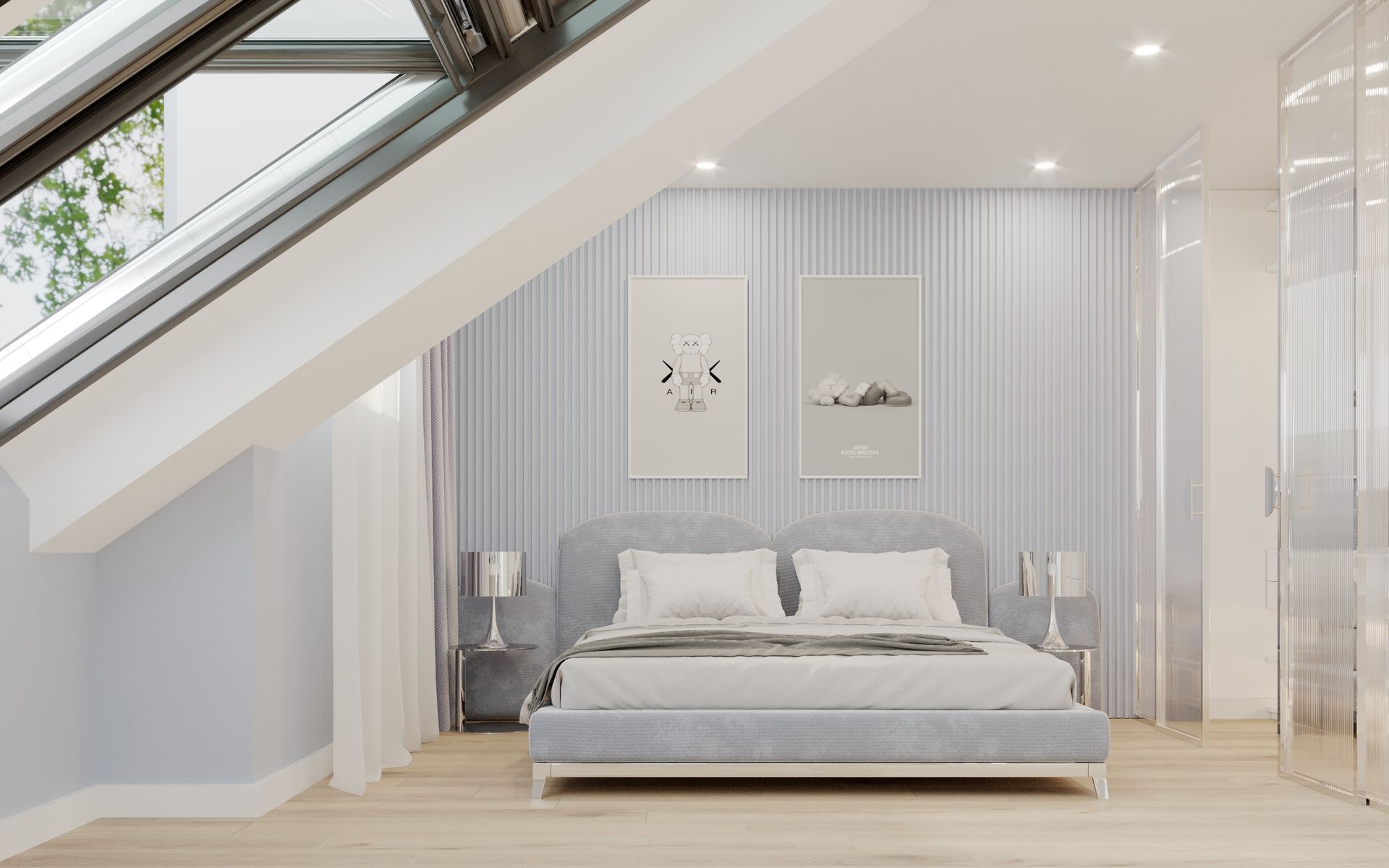 The master bedroom is decorated in neutral tones, creating a calm and timeless atmosphere.