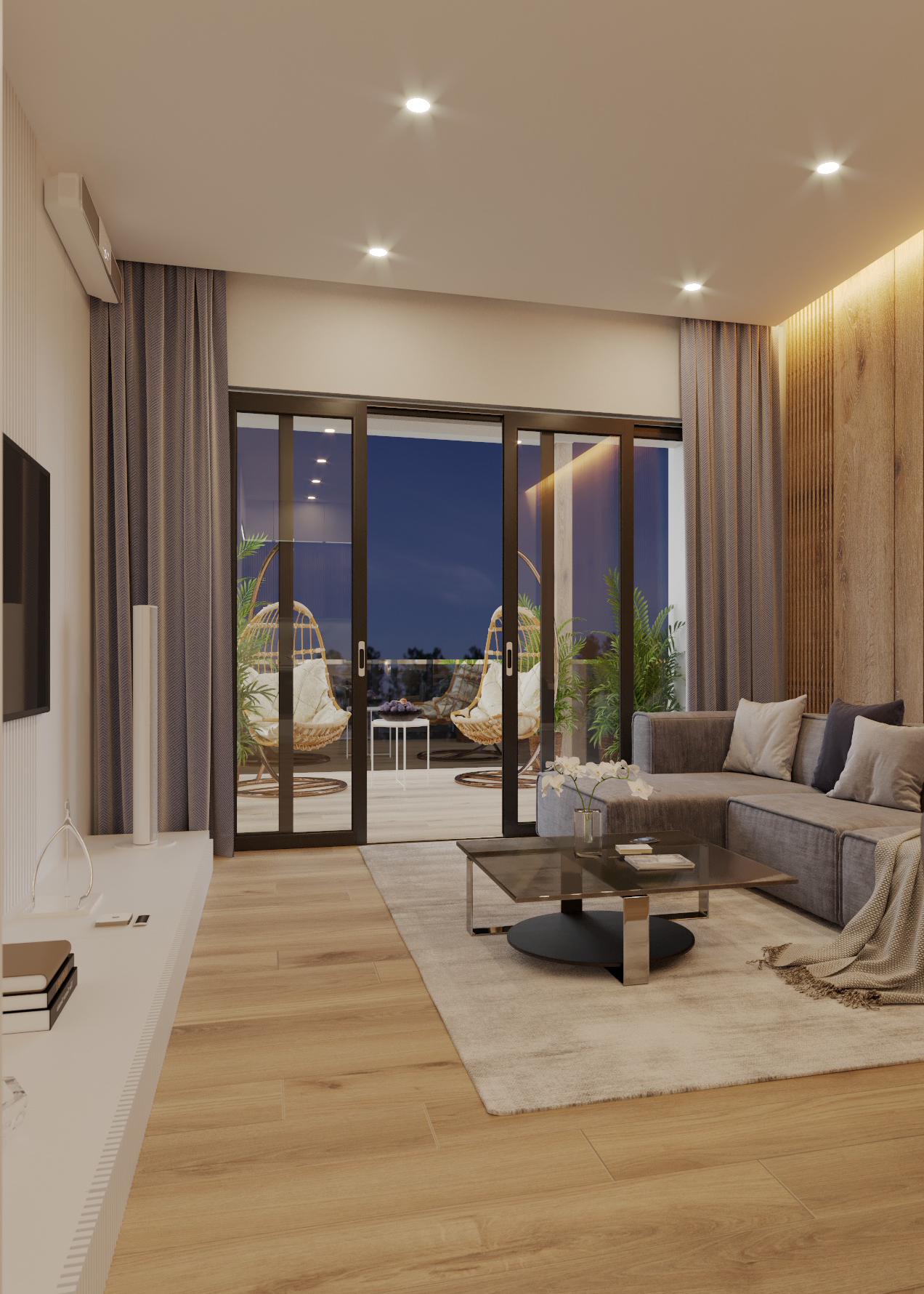 The kitchen-living room is decorated with wood and soft purple accents. The built-in “smart home” system provides convenience: integrated speakers, lighting control, and multimedia. The area flows smoothly into a large terrace with rocking chairs — the perfect place to relax in the fresh air.